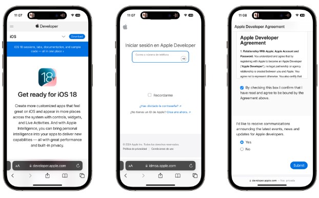- iPhone에서 developer.apple.com으로 이동합니다.